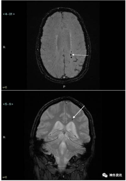 图1. SWI和T2*GRE显示同一患者顶叶微出血灶。上图为SWI图像,白箭头指示3个微出血灶;下图为T2*GRE图像,白箭头指示1个微出血灶。