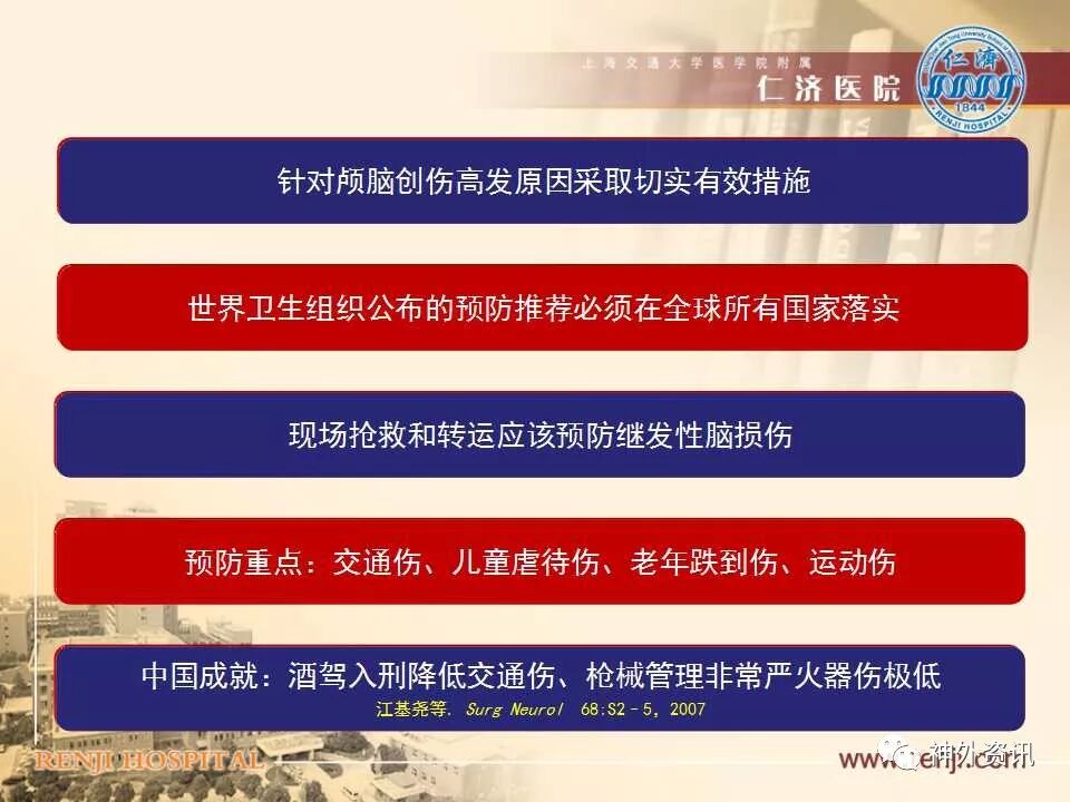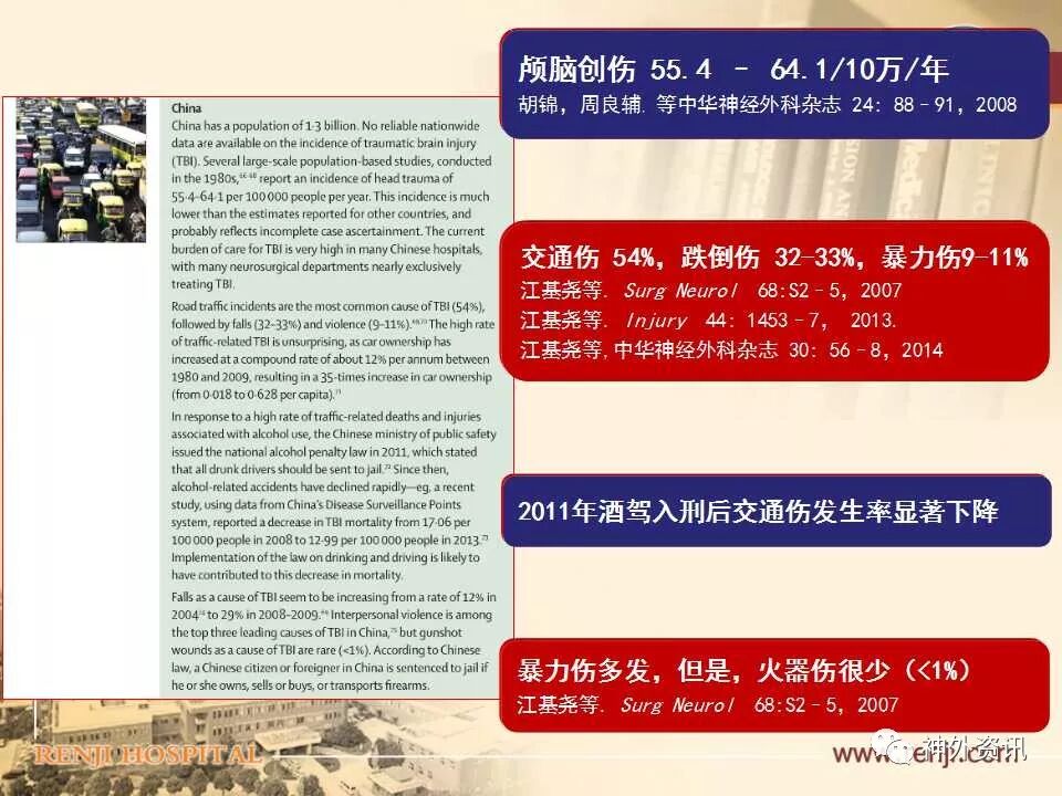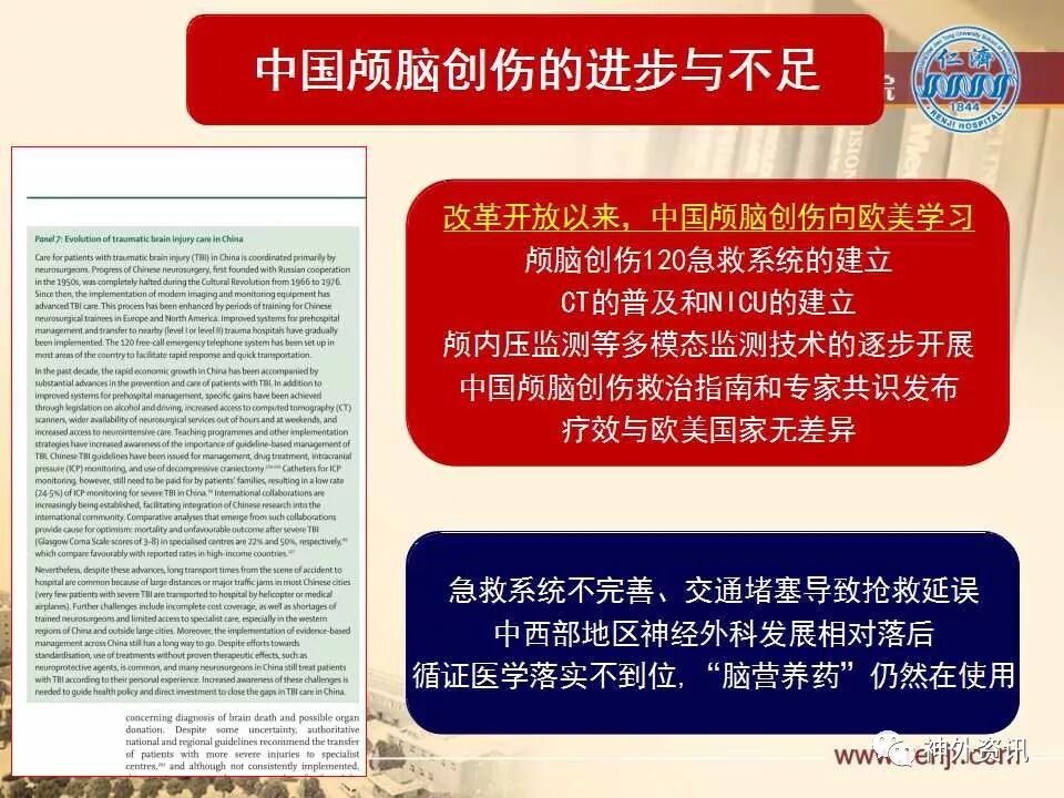 颅脑外伤是世界瞩目的公共卫生问题,知名的柳叶刀神经病学杂志《THE LANCET Neurology》(IF=26.284,神经科学排名第一)近期刊登了关于颅脑创伤的专刊《多途径整合提高全球颅脑创伤防治和研究水平》(《Traumatic brain injury:integrated approaches to improve prevention, clinical care, and research》)。