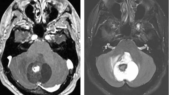 图3. 图示为向四脑室延伸和压迫的蚓部毛细胞星形细胞胶质瘤。肿瘤呈囊性,伴有明显强化的结节。囊壁未见强化,无需手术切除。