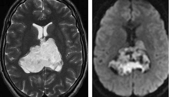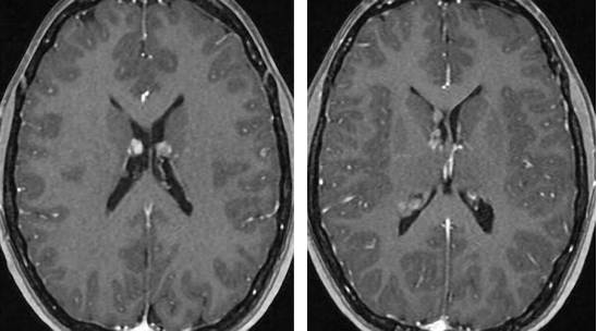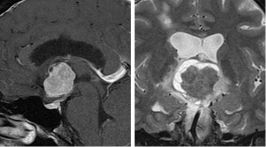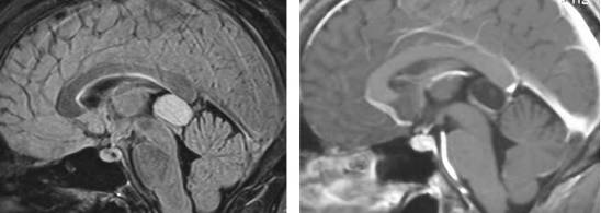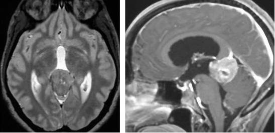 图4. 松果体细胞瘤在T2相上表现为高信号,伴有周围强化。松果体细胞瘤一般生长缓慢,偶尔需要手术干预。