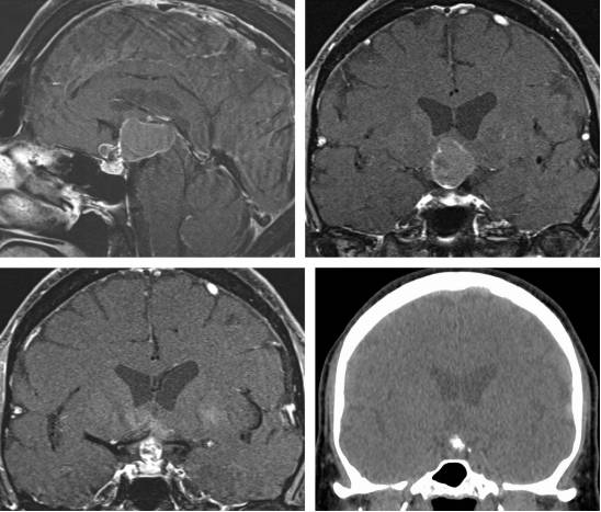图2. 颅咽管瘤在MR图像上表现为不均匀的囊性和实质性信号(上图)。其囊性成分在T1相上表现为高信号,结节部分则表现为不均匀的显著强化(左下图)。CT上表现为点状钙化(右下图)。