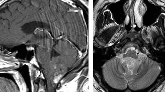 这类肿瘤常见于小脑,并向第四脑室延伸,但也可能起源于第四脑室顶,并逐步向外隐窝和桥臂蔓延。常常可见巨大的囊性成分。