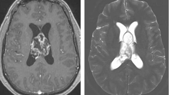 高级别胶质瘤(WHO III级和IV级)最常起源于胼胝体、丘脑或透明隔。这些病灶偏向于侧脑室前角的一侧生长。