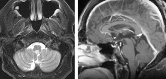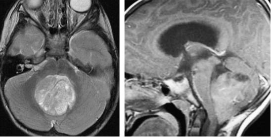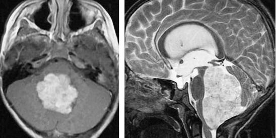 髓母细胞瘤是小儿四脑室肿瘤中最常见的类型。它可占据整个四脑室,对脑干和小脑产生占位效应。与室管膜瘤不同,这些病灶不会侵犯脑室底部,但是起源于上髓帆。髓母细胞瘤会插入到桥臂和外隐窝。