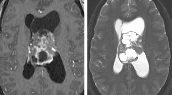 毛细胞星形胶质细胞瘤是WHO I级、良性、慢性生长的一类肿瘤。这类肿瘤可能起源于中脑、丘脑或下丘脑,向第三脑室延伸。