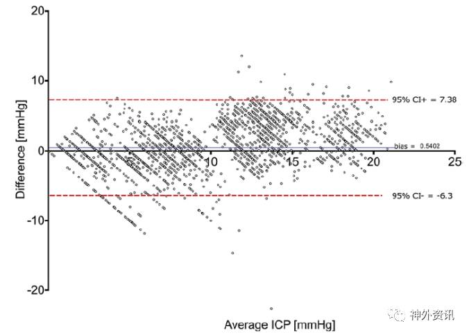 图3. Bland-Altman法显示有创与无创ICP监测的一致性良好。
