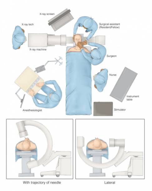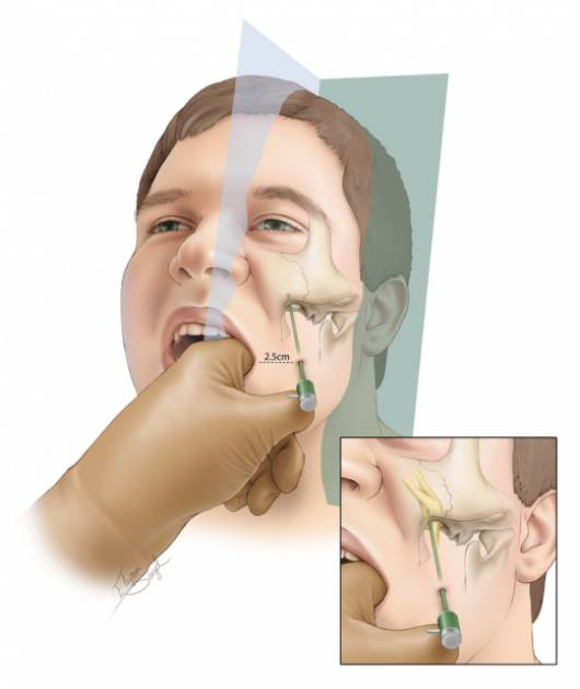 笔者通过将手指放入口腔以确保进针过程中不会穿破颊粘膜,同时触摸翼突,因为骨孔位于此标志外侧。接着,作者触摸下颌骨然后在其内侧进针。使用牙垫防止手术医生的手指被咬伤。可以通过侧方和斜视方透视图改变进针方向以到达骨孔。