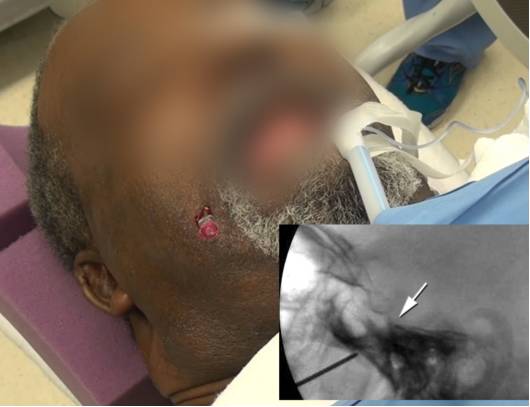 在穿刺针抵到颅底岩斜交界处的理想位置时,与穿刺针长轴同轴的斜位X线透视可引导针尖最后从外侧向内侧微调至穿透骨孔。在此斜位片下,患者的头部是向对侧旋转45度角的,患者的颈部也是过伸的。