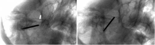 图12. X线斜位图示针尖恰好位于骨孔后方(左图,白箭头);微调后确认穿刺针在骨孔内(右图)。
