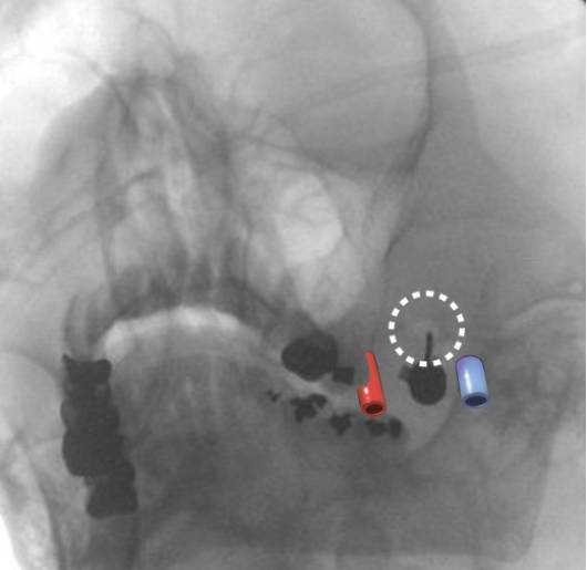 图5. 左卵圆孔(虚线内)的X线斜视透射图,方向与穿刺针平行。注意颈内静脉(蓝)和颈内动脉(红)与卵圆孔之间大概的相对位置。