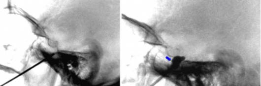 图13. 穿刺针稍微向前穿入骨孔。侧方透视图确认穿刺针的最终位置超出颅底(左图)。在球囊压迫神经根阻断病例中,如图所示将球囊在半月神经节池中充气(右图)。球囊的最终位置表明它轻微向圆孔扩展(蓝箭头)。