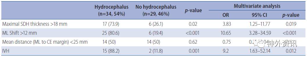 63例患者中,34例(53%)出现脑积水。单因素分析发现,术前伴有脑室内出血的患者术后易出现脑积水,另外,术前硬膜下血肿体积较大、中线偏移明显者更易发生术后脑积水。多因素分析显示,硬膜下血肿量(p=0.019)、中线偏移程度(p<0.001)、伴有脑室内出血(p=0.012)是术后发生脑积水的独立危险因素(表1)。去除的骨瓣大小、脑水肿的程度和血肿位置等对患者术后发生脑积水的影响较小。