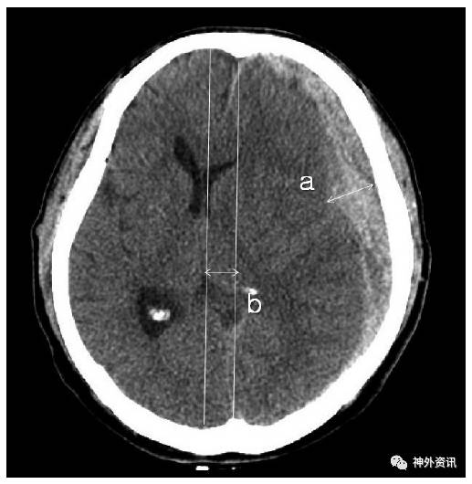 图2. 硬膜下血肿的厚度(a)和中线的偏移程度(b)。