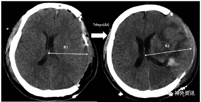 图3. 脑水肿进展速度计算公式(R2-R1)/t。