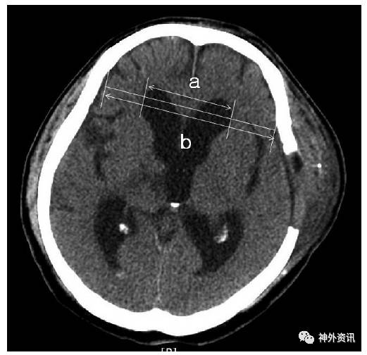 图1. 脑水肿定义为改良前角指数a/b≥33%。
