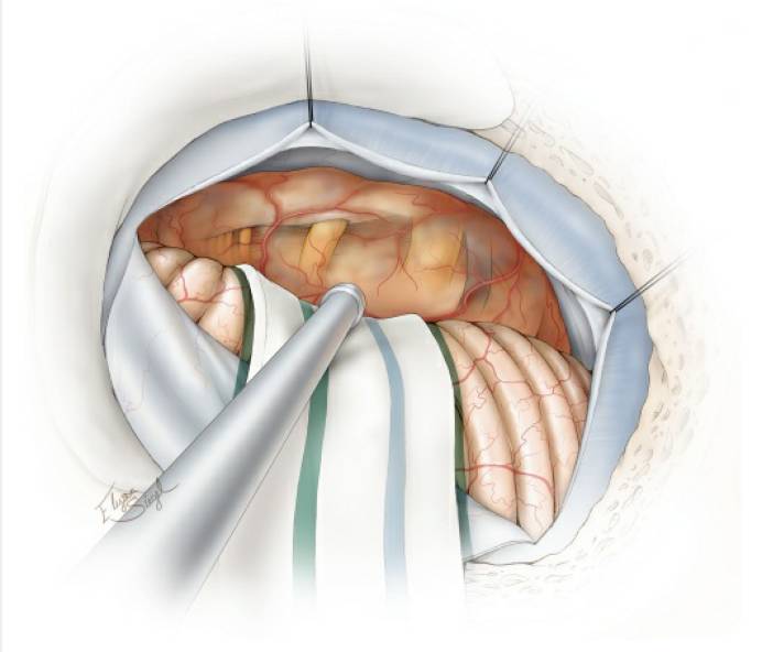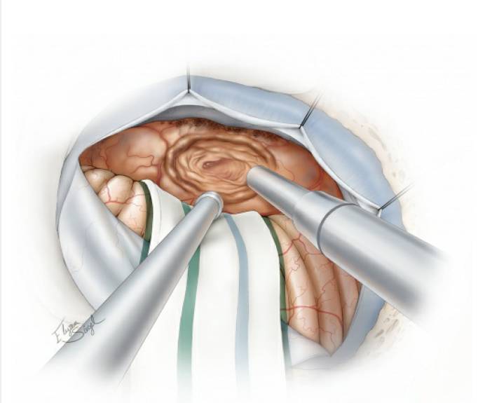 图4. 硬膜下初步暴露位于左侧的肿瘤。注意图中所示:去除乙状窦表面的骨质后,可以用缝线沿乙状窦边缘悬吊,将乙状窦牵开,获得更好的手术视野(扩大乙状窦后入路。译者注)。如果没有预置腰大池引流,则可通过打开后组颅神经周围的脑池释放脑脊液。随后,分离肿瘤后缘与小脑表面的蛛网膜粘连。