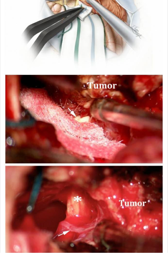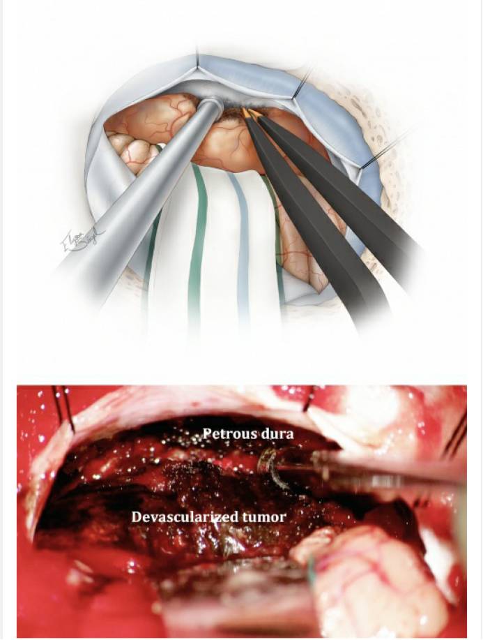 如前所述,瘤内减压前最大程度地阻断血供可避免过多的出血,同时也能达到更有效的减压,更重要的是,在分离与脑干和颅神经粘连的时候提供一个无血、清洁的手术视野。