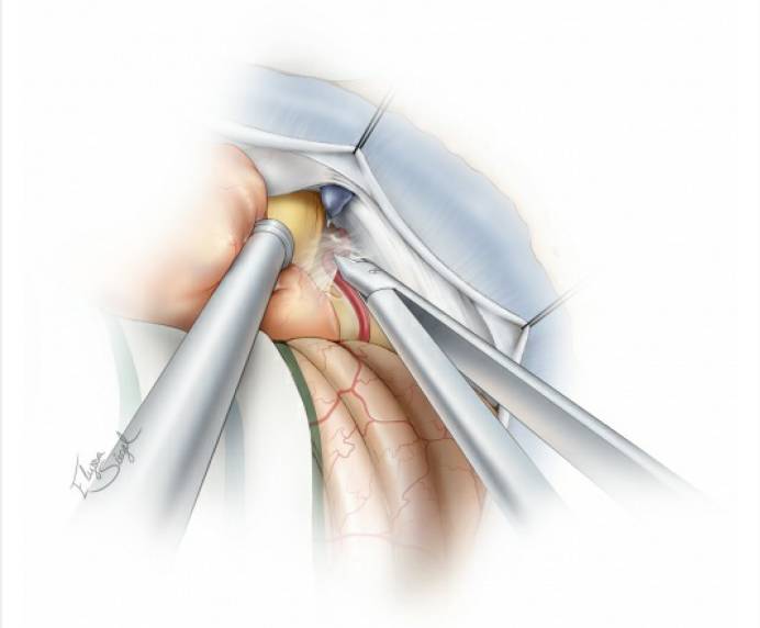 笔者通常会在手术开始时留置腰大池引流管,适当释放脑脊液以减轻幕下的张力;这样可使术者能够较早且安全的推移肿瘤(未进行瘤内减压之前),便于彻底地阻断肿瘤依附于岩骨的供血。这一操作提高了术中肿瘤内减压和分离的效率。