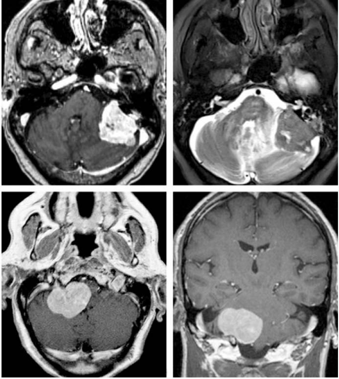 图1. 上图为一例左侧岩骨脑膜瘤或CPA脑膜瘤,肿瘤通常偏离内听道生长,且与岩骨后面的硬膜广基底相连。下图为一例右侧颈静脉孔脑膜瘤,肿瘤无明显向孔内生长。