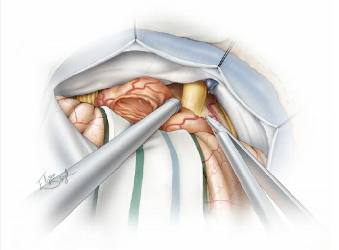 图12. 清晰显示发自小脑上动脉分支的肿瘤供血动脉,将其分离追踪至肿瘤,然后电凝并离断。将肿瘤从三叉神经根部和桥脑外侧缘进行锐性分离,注意保护好桥脑腹侧表面的软脑膜静脉。此时有必要继续逐步瘤内减压使肿瘤松动,可避免将重要结构置于牵拉损伤的境地。