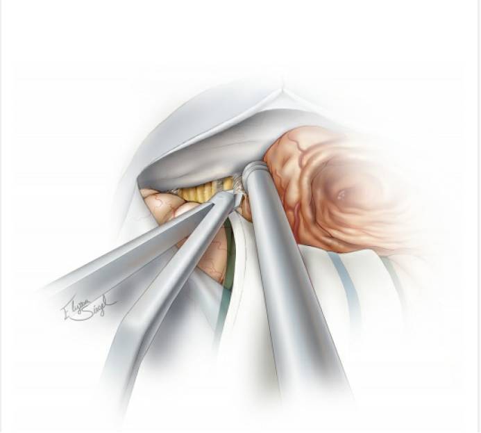图9. 充分的瘤内减压使得肿瘤包膜移动灵活,从而无需对正常组织结构进行不必要的牵拉。然后将肿瘤下极包膜与后组颅神经进行锐性分离。注意仔细保留包绕神经的蛛网膜,细致松解粘连的血管。