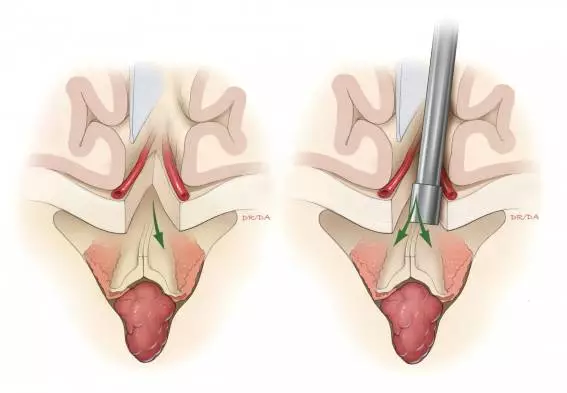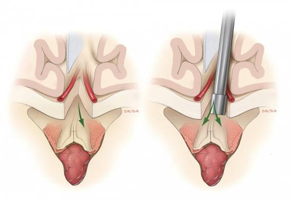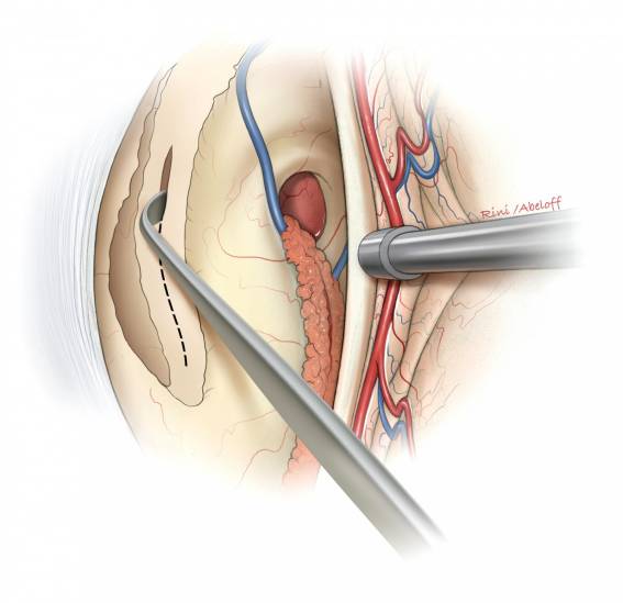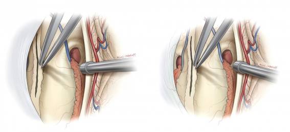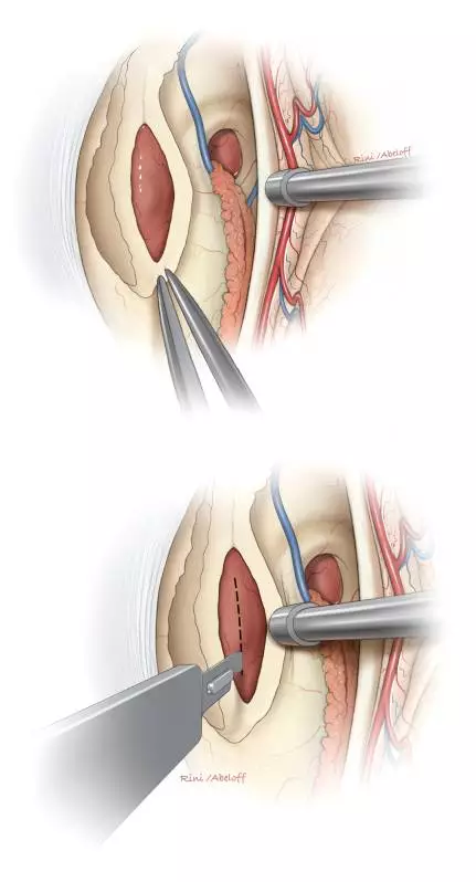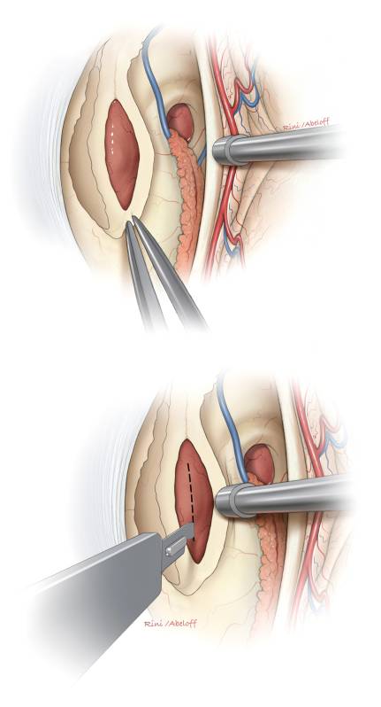 图6. 在肿瘤囊壁上方轻柔的移动穹窿体(上)。穹窿间沟的显露从室间孔水平开始向后延伸2cm。接下来,进入肿瘤囊壁开始肿瘤内减压(下)。