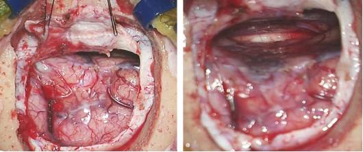 图9. 图示切除肿瘤采用小型右额开颅和半球间入路(左)。患者头侧位,使右侧位于下方。新手在侧位时可能会迷失指引手术通道的重要解剖标志。