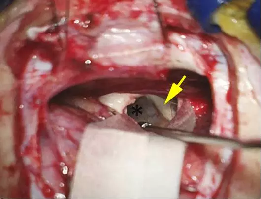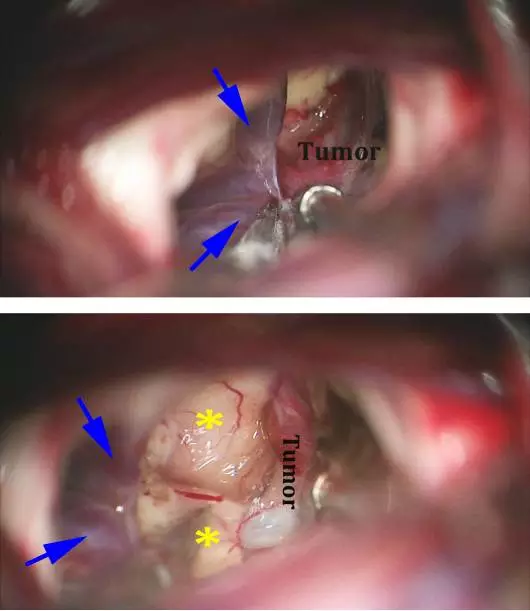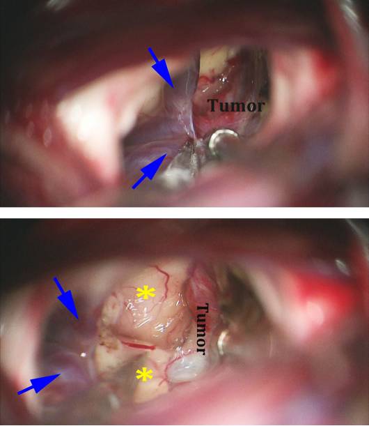 图12. 采用显微剪刀分离双侧大脑内静脉(蓝色箭头)后显露肿瘤包膜后方(上图)。这一分离有助于识别三脑室壁(*)和囊肿后壁(下图)。