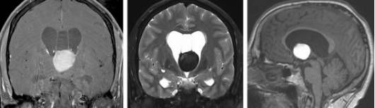图1. MRI显示一个大的出血性胶样囊肿。透明间腔(第五脑室)的存在创造了穹窿间的潜在空间,这有利于穹窿间入路的使用。