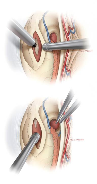 图7. 需要用超声刀移除肿瘤,而不能过度牵拉包括三脑室壁在内的重要周边结构(上)。也可以经扩大的室间孔移除肿瘤的前极(下)。