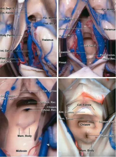 图2. 显示经脉络丛和穹窿间的分离(上排)。注意经穹窿间入路广泛打开大脑内静脉和三脑室底后更开阔的显露。下图更进一步说明三脑室底相关的解剖结构。这种广泛的显露可能以双侧穹窿体的潜在损伤为代价。不要过度牵拉非常容易损伤的大脑内静脉。