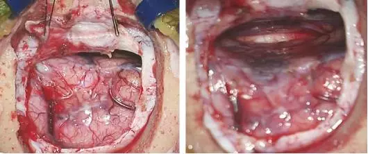 一旦成功进入右侧脑室,笔者将进入透明隔间腔寻找穹窿间沟。如果双侧透明隔融合在一起,笔者尝试在二者之间寻找潜在的小间隙。如果这样仍然不太容易,笔者用双极电凝切除部分透明隔,直至穹窿体背部,然后用显微器械锐性分开穹窿间沟。