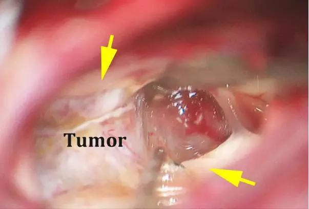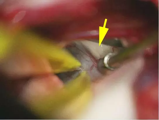 图11. 高倍镜下的术野(与图4相比较):经透明隔间腔显示左侧穹窿(黄色箭头)和经穹窿间沟显示肿瘤包膜(位于双极镊子头处)。