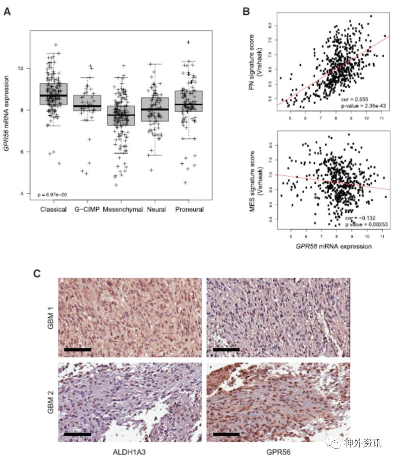 图1. GPR56在间质型GBM中表达下调。A.不同亚型GPR56表达差异;B.GPR56表达量与间质型标志分数呈负相关;C.免疫组织化学检测GPR56在间质型GBM中表达下调。