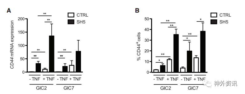 作者分析生物信息学癌症基因组图谱(TCGA)结果和免疫组织化学检测结果显示,相比于其他GBM亚型,GPR56在间质型胶质母细胞瘤(MES-GBM)中表达下调,其表达量与GBM临床样本中的间质型标志物呈负相关(图1)。为证实GPR56在胶质母细胞瘤间质型分化过程中的作用,作者选取胶质瘤干细胞样初始细胞(glioma stem-like initiating cells,GICs)的不同细胞系研究分化过程。结果表明,GPR56在向MES分化的GICs(MES-GICs)中表达下调;TNF-α具有促进MES-GICs向MES-GBM分化的作用。为了证明GPR56在TNF-α诱导分化过程中的作用,作者首先用siRNA技术构建GPR56低表达载体,测定CD44的表达量和CD44阳性细胞百分比。结果证明,GPR56低表达在促进MES-GICs向MES-GBM分化过程中发挥作用。该作用和TNF-α促进MES分化的作用具有协同性,提示GPR56和TNF-α可能通过相同的信号通路起作用(图2)。