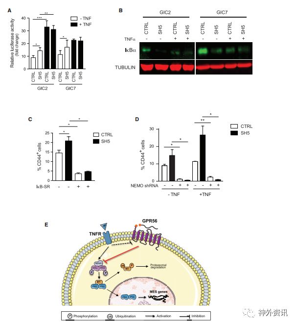 图3. GPR56通过NF-κB信号通路抑制间质分化。A.荧光素酶活性实验监测TNF-α处理或者未处理的GPR56敲除或者对照组;B.Western blot分析GICs中IκBα蛋白水平;C、D.流式细胞术测量CD44阳性的细胞百分数;E.GPR56通过NF-κB信号通路发挥作用示意图。