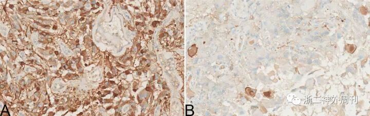 图3. 免疫组织化学示A.GFAP染色阳性;B. Syn散在阳性。