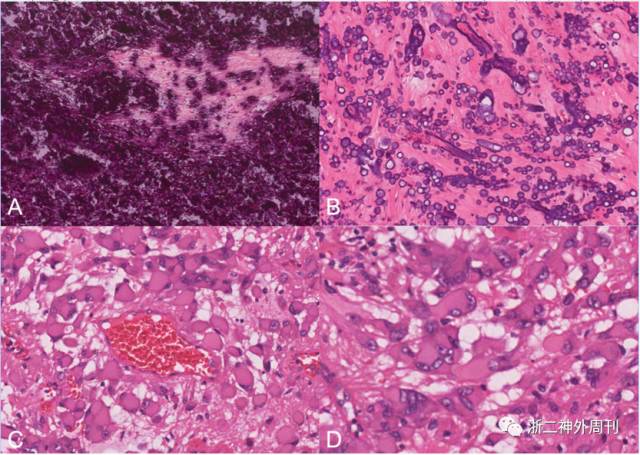 图2. 肿瘤由富于钙化区和富于细胞区组成(HE染色)。A,B:肿瘤富于钙化区见大量砂砾体样钙化及血管壁钙化; C,D:肿瘤富于细胞区呈片状生长,细胞呈圆形、多角形,胞浆丰富,嗜酸性,具有胶质纤维突起,可围绕小血管形成假菊形团;可见明显的核仁,多形性核,及多核巨细胞,未见核分裂像。
