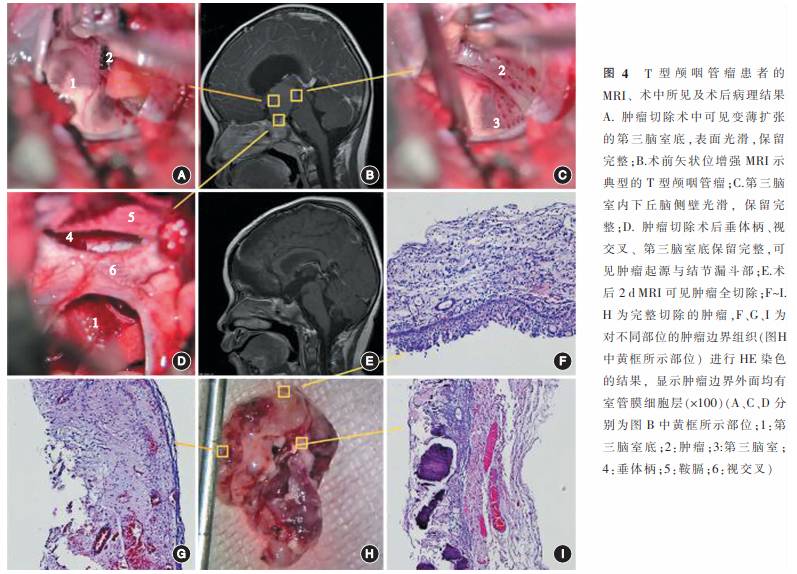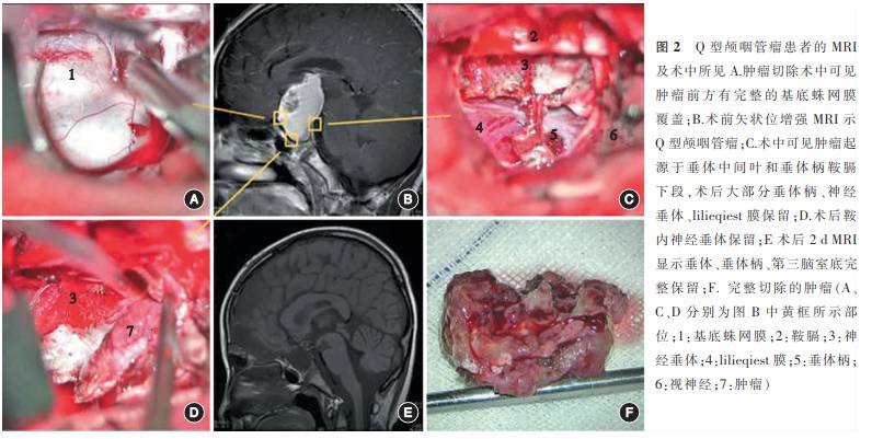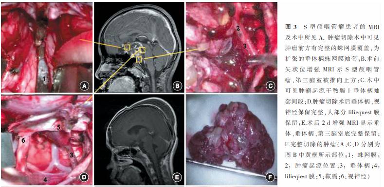 颅咽管瘤起源于胚胎时期Rathke囊形成颅咽管时的残余上皮细胞[15,20]。因而,自口咽部、鞍底残迹沿垂体中间叶、垂体柄全长至第三脑室底均可发生肿瘤,本组117例颅咽管瘤被术中证实均起源于垂体中间叶和垂体柄连线(组织学检查证实,即使为凸入第三脑室底部的肿瘤亦有室管膜完整覆盖)。QST分型即根据起源处垂体柄与蛛网膜覆盖情况不同的膜性概念进行分型。垂体柄分为鞍膈下、袖套外、袖套间及袖套内疏松部4段,由于袖套外段仅为一潜在间隙,因此将颅咽管瘤分成3型,其中Q型为蛛网膜外肿瘤;S型为袖套段起源的肿瘤,肿瘤可在一个或多个重要节段生长,为蛛网膜腔内肿瘤;T型肿瘤起源于垂体柄的袖套内段结节漏斗部,由于蛛网膜分布的个体差异,肿瘤可向第三脑室及蛛网膜腔生长,或完全向第三脑室方向生长,部分患者由于袖套完整,甚至可形成穿垂体柄生长的方式,但其共同的特点是无蛛网膜间隔,而向第三脑室生长的肿瘤顶部均有室管膜的覆盖。