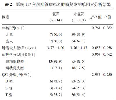 3. 影响颅咽管瘤患者肿瘤复发的单因素分析结果(表2):随访时间为60~86个月,平均(69.6±13.8)个月。肿瘤复发率为12.0%(14/117)。不同年龄、肿瘤最大径、病理学分型、QST分型的患者其复发率的差异均无统计学意义(均P>0.05)。14例复发颅咽管瘤均与原发肿瘤有相同的QST分型。