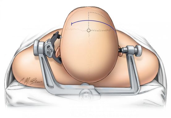 图5. 固定头架,颈部略屈曲以利于颅内静脉回流。标记出双侧冠状切口(Soutar切口)的3/4长度和骨瓣切开的范围,骨瓣内侧缘位于上矢状窦,这一入路在切除额叶时可进入前纵裂探及大脑前动脉,骨瓣的后缘是冠状缝,仅在骨窗后缘钻单孔就足够。需要注意的是骨瓣的前缘不要求平前颅底,且避免打开额窦。