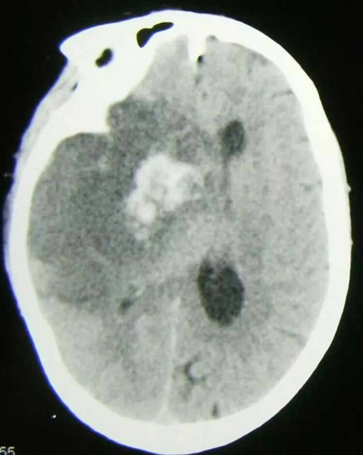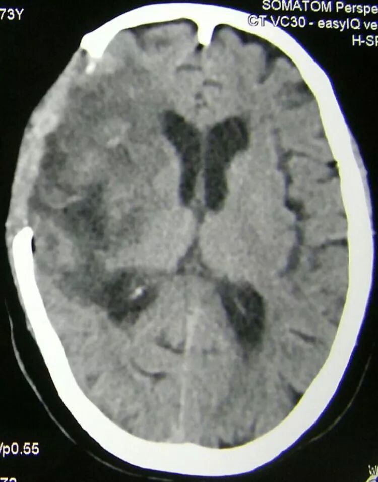 cT显示:右侧半球大面积低密度灶,内部存在高密度出血性,中线明显移位,鞍上池及三脑室消失。