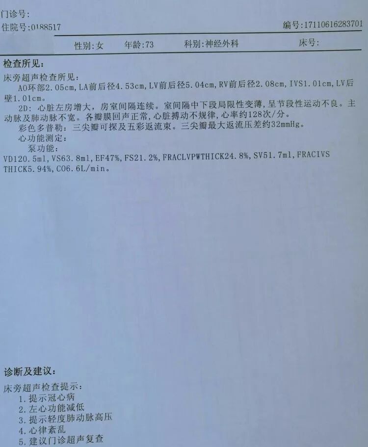 心脏超声示左心功能低下,心律紊乱。