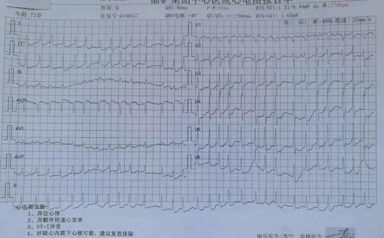 心电图示快速房颤,心率179次/分。