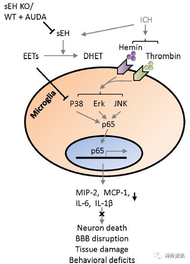 ICH建立后3小时至4天,ICH小鼠大脑出血半球的sEH蛋白水平升高。sEH在脑水肿周围组织中的小胶质细胞、巨噬细胞、星形胶质细胞、神经元和内皮细胞中均有表达。敲除sEH基因能够显著下调微胶质细胞或巨噬细胞活化和炎症介质的表达,在ICH建立后第1天和第4天内降低EET的降解水平。在ICH后第1天和第4天,敲除sEH能够抑制血脑屏障的渗透性、减轻基质金属蛋白酶9(MMP-9)活性和中性粒细胞浸润的神经损伤。类似的是,注射药物AUDA能够减弱脑出血后第1天小神经胶质细胞或巨噬细胞活化和降低EEF降解水平。到28天,敲除sEH基因或用AUDA抑制sEH均能够减轻脑出血引起的脑损伤和神经功能障碍。AUDA能够减缓神经元死亡、血脑屏障破坏、基质金属蛋白酶9活性和中性粒细胞浸润。然而,无论是敲除sEH基因或注射AUDA均不能够减少ICH发生后的血肿体积。敲除sEH基因或注射AUDA可以减弱凝血酶或氧化血红素诱导的小神经胶质细胞活化。在BV2型小神经胶质细胞中,AUDA减少凝血酶和氧化血红素引起的P38 MAPK和NF-κB激活。最终,AUDA抑制BV2型神经胶质细胞介导的N2A神经元死亡。