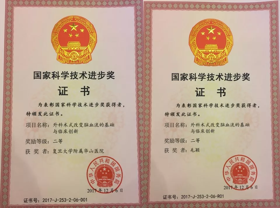 2018年1月8日上午,2017年度国家科学技术奖励大会在北京人民大会堂隆重举行。复旦大学附属华山医院副院长兼神经外科常务副主任毛颖教授领衔的项目《外科术式改变脑血流的基础与临床创新》荣获国家科学技术进步奖二等奖!
