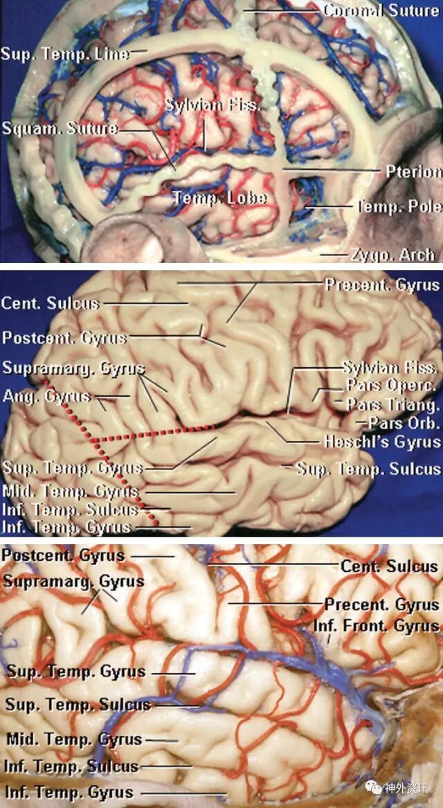 下图: Postcent. Gyrus = 中央后回;Supramarg. Gyrus = 缘上回;Sup.Temp. Gyrus = 颞上回;Sup. Temp. Sulcus = 颞上沟;Mid. Temp. Gyrus = 颞中回;Mid. Temp. Sulcus = 颞中沟;Inf. Temp. Sulcus = 颞下沟;Inf.Temp. Gyrus = 颞下回;Cent. Sulcus = 中央沟;Precent. Gyrus = 中央前回;Inf. Front. Gyrus = 额下回