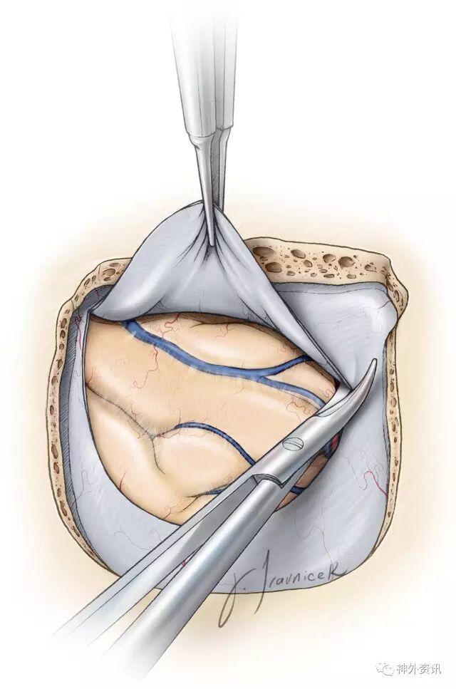 图8. 如图所示,剪开硬膜以切除实质内病灶。