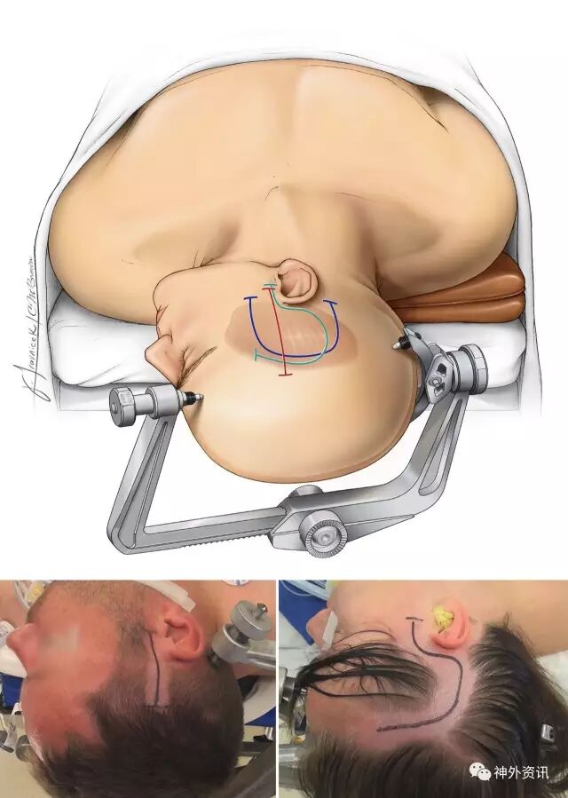 图4. 在经颞和颞下入路中,不同的皮肤切口方式和头钉放置的位置。对于超过颧弓水平的切口,应该保留颞浅动脉的主干,用手触摸动脉的搏动可帮助设计皮瓣。如果可能,我更倾向于使用直切口,因为这类切口愈合更快。