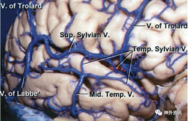 V. of Trolard = Trolard静脉(上吻合静脉); V. of Labbe’ =Labbe静脉(下吻合静脉);Mid. Temp. V. = 颞中静脉;Temp. Sylvian V. = 侧裂颞侧静脉; Sup. Sylvian V.= 侧裂上静脉